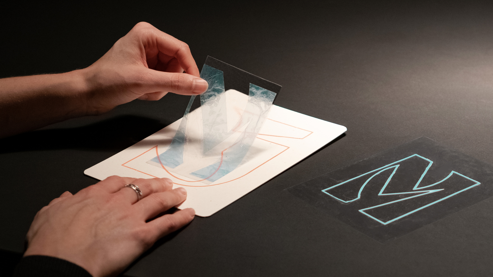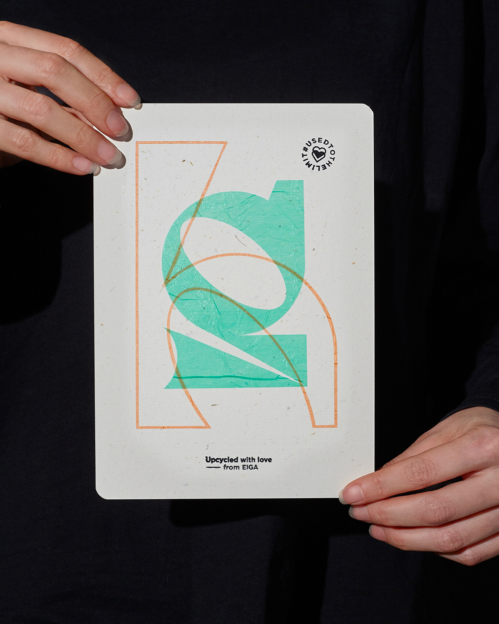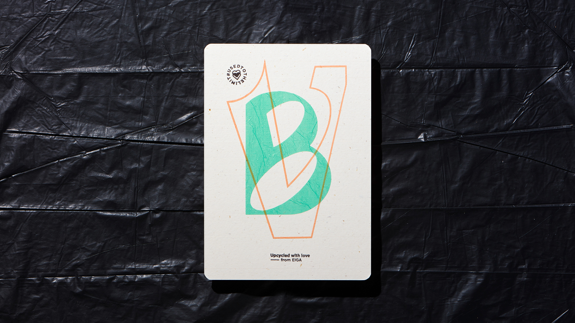 We cut out transparent letters from the film of used plastic bags. The font was designed specifically for the project on the basis of a reduced modular system of fewer basic forms. The repeatedly new combinations of our customers’ initials were pasted onto the cards, which were recycled from straw. For the final step, the copy text and seal were stamped on. #USEDTOTHELIMIT