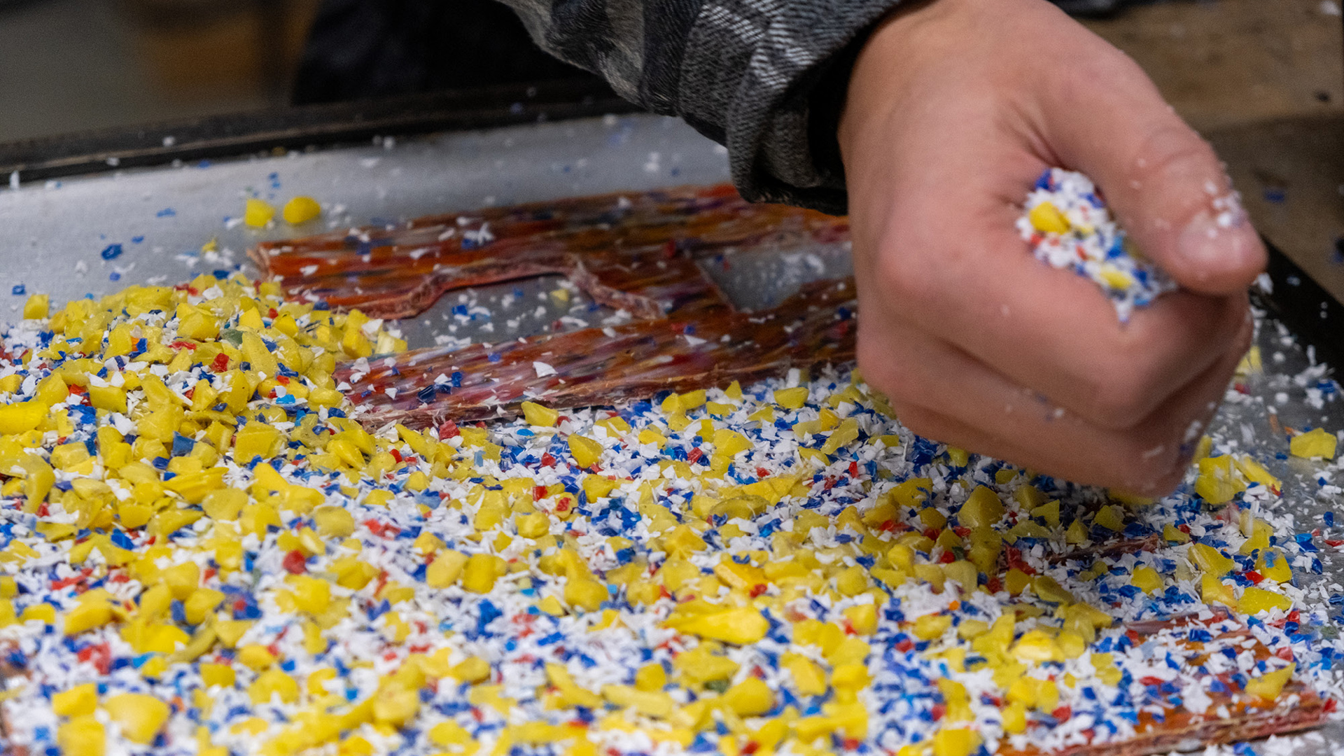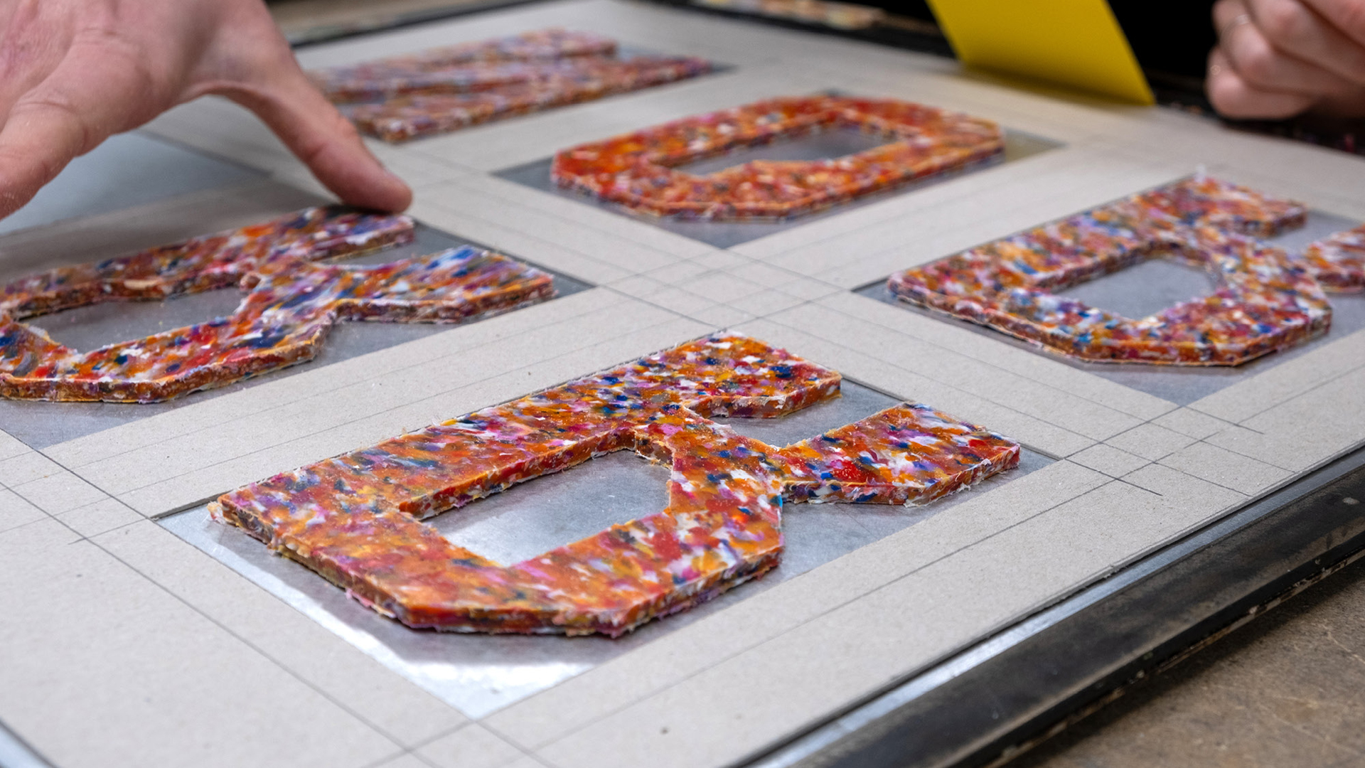 Recycled plastic has never looked so good. For months, our team collected different colored plastic waste. We carefully curated shades and color combinations and shredded the sorted plastic. Using the workshop of ‘Precious Plastic’, this material was pressed into boards in various color combinations.